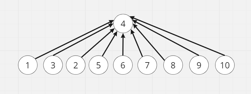 아래의 Union 연산들을 수행해 보겠습니다. 다음은 트리의 편향이 일어나는 입력 예시입니다.