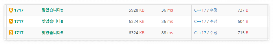 첫 번째 코드가 세 가지 최적화를 모두 적용한 코드이고, 두 번째 코드가 랭크 최적화와 경로 압축만, 세 번째 코드가 경로 압축만 적용한 코드입니다. 확실히 랭크 최적화까지 적용한 코드가 시간적인 면에서 2배 이상 빠른 것을 알 수 있습니다. 또한 Weighted Union Find를 사용한 코드가 공간 복잡도도 조금이나마 줄어든 것을 볼 수 있습니다.