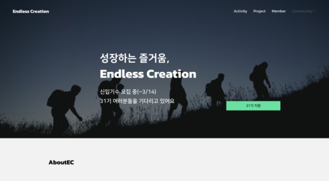 → 동아리의 main title, 핵심 가치, 프로젝트, 모집 내용, FAQ로 구성된다. - About Us: 동아리의 역사, 활동 내용 등을 소개하는 페이지이다.