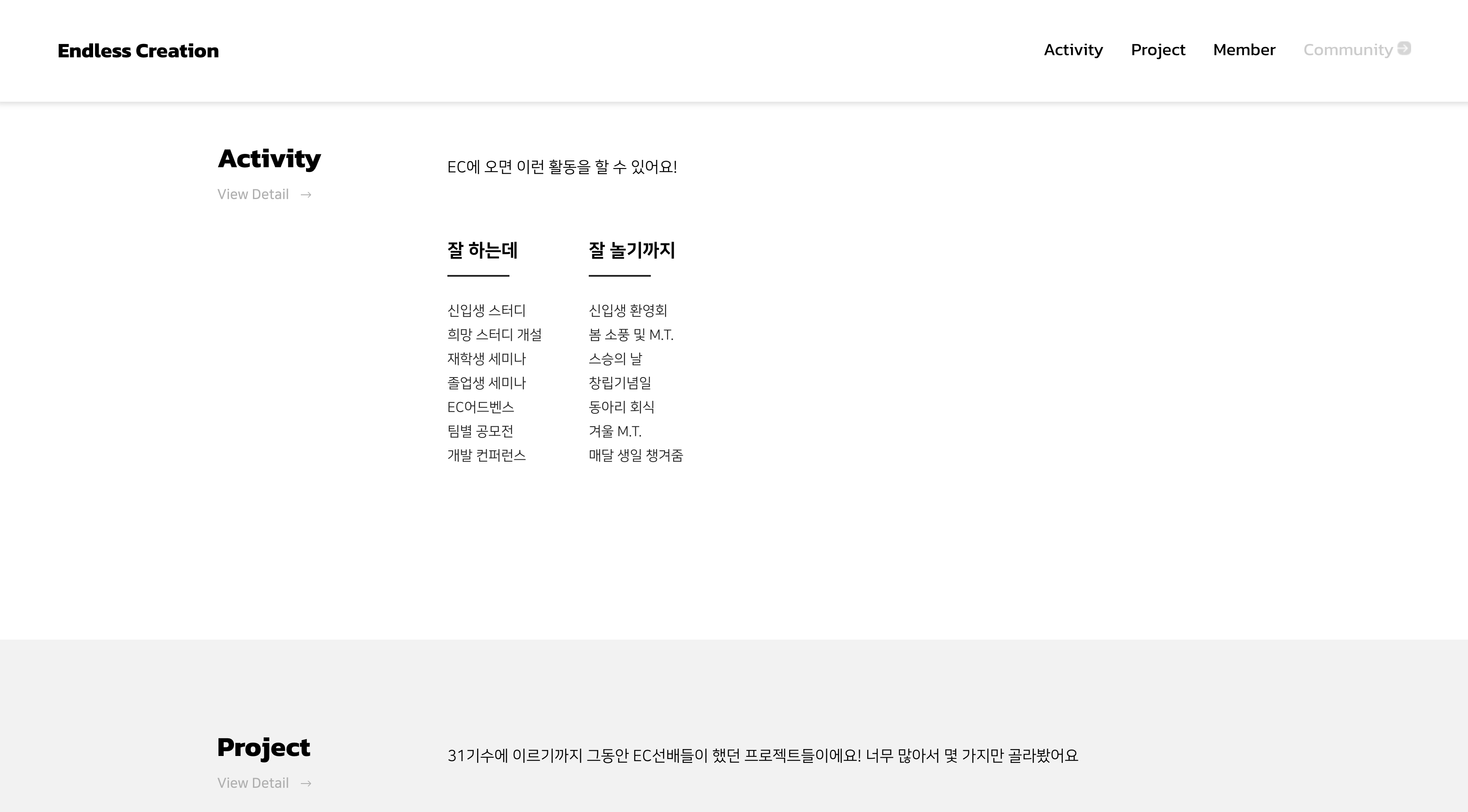 - Home: 동아리에 대한 전반적인 내용을 소개 페이지이다.