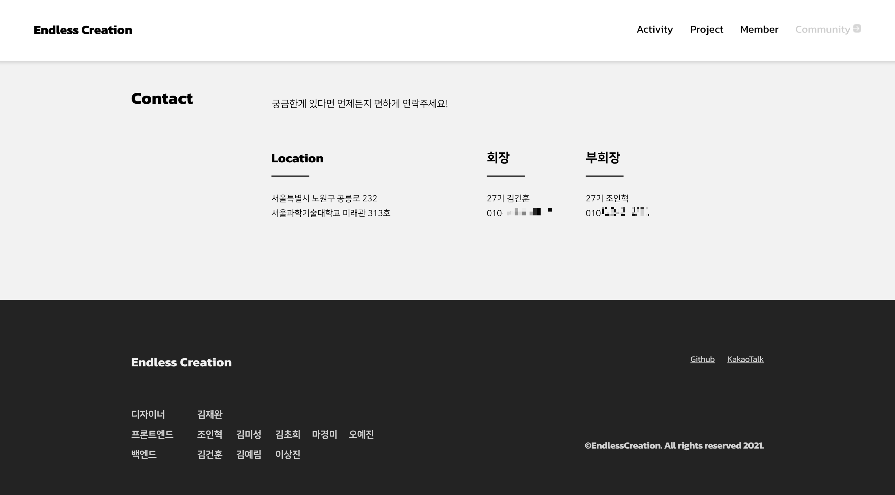→ 동아리를 소개하는 문구, 임원진 정보, 활동 사진으로 구성된다. - Members: 동아리의 member들을 소개하는 페이지이다.