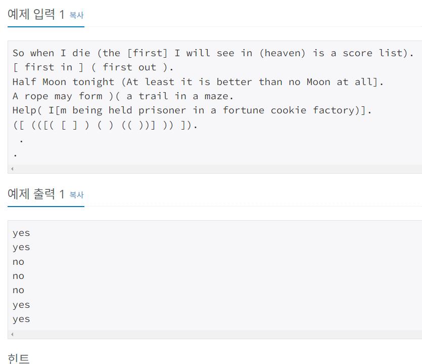 각 문자열은 마지막 글자를 제외하고 영문 알파벳, 공백, 소괄호("( )"), 대괄호("[ ]")로 이루어져 있으며, 온점(".")으로 끝나고, 길이는 100글자보다 작거나 같다. 입력의 종료조건으로 맨 마지막에