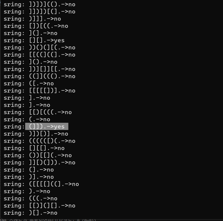 하지만 틀렸다고 나와서 반례를 찾다가 못찾겠어서 랜덤함수를 이용하여 무작위로 괄호들을 생성하여 테스트해본 결과 반례를 찾을 수 있었다.