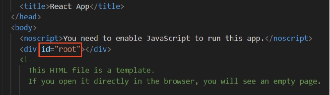 위의 코드를 보면 ReactDom.creatRoot()에 DOM 엘리먼트를 전달합니다. DOM 엘리먼트는 getElementById('root')에 의해 해 호출되는데 index.html파일에 들어가보면 id="root"인 태그가보입니다.