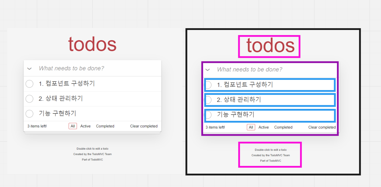 To Do List를 예로 들어보면 위의 검은색, 분홍색, 보라색, 파란색 박스들이 모두 컴포넌트입니다. 위의 박스들 말고도 버튼, 글자들도 모두 컴포넌트에 해당됩니다. 이처럼 컴포넌트는 사용자가 정의하기 나름입니다.