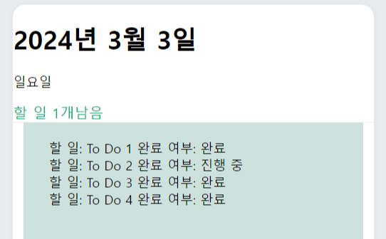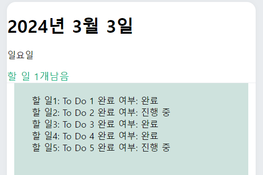 <div>할 일: {task} 완료 여부: {isDone}</div>