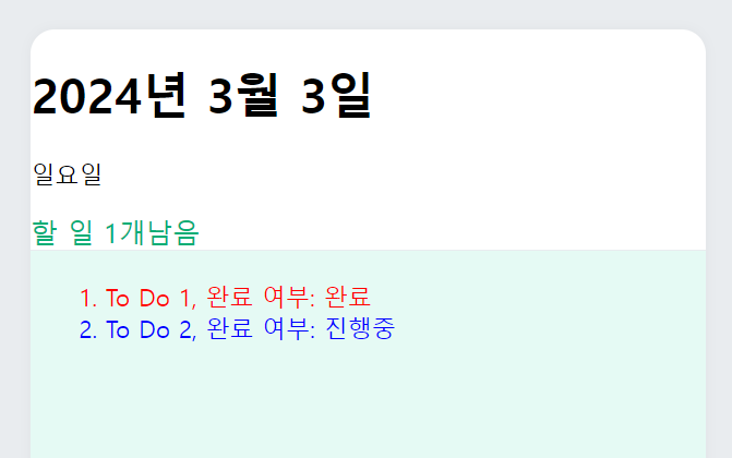 이 패턴은 컴포넌트 안에서 렌더링되는 UI의 형태가 다를 때 유용합니다. 다음과 같이 할 일의 완료 여부에 따라 렌더링되는 UI의 색이 다르게 해봅시다.