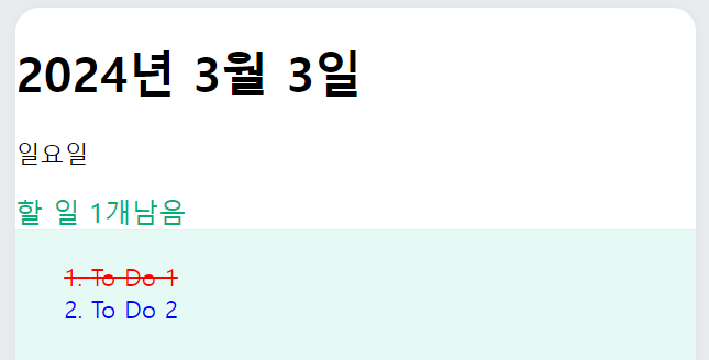이 패턴은 컴포넌트 안에서 렌더링되는 UI의 형태가 다를 때 유용합니다. 다음과 같이 할 일의 완료 여부에 따라 렌더링되는 UI의 색이 다르게 해봅시다.