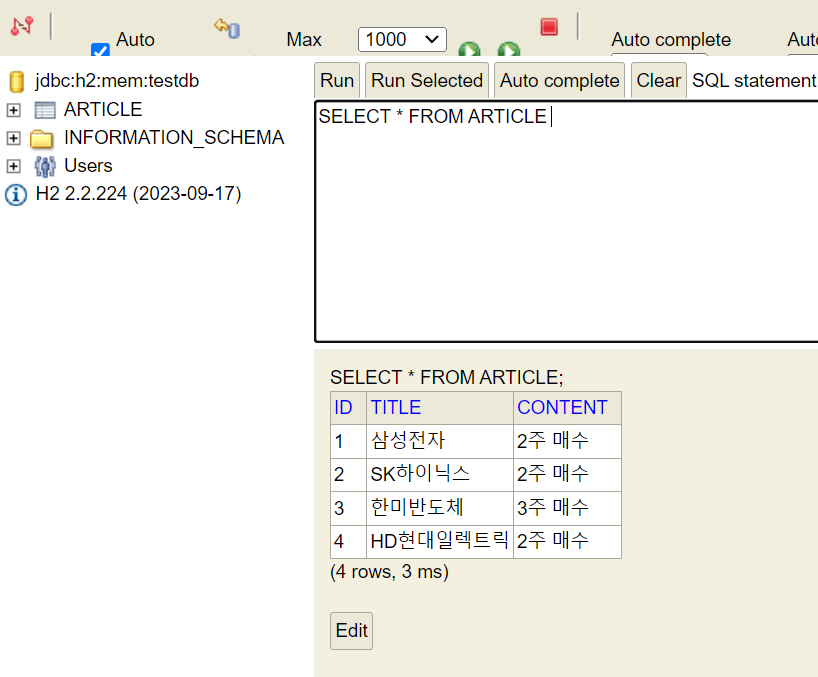 JPA가 초기화되기 전에 SQL 쿼리가 먼저 실행되었고 데이터가 DB에 잘 저장되었습니다. 이렇게 In-Memory Mode를 사용하면 즉석에서 바로 단뒤 테스트를 위한 환경을 구축할 수 있습니다.