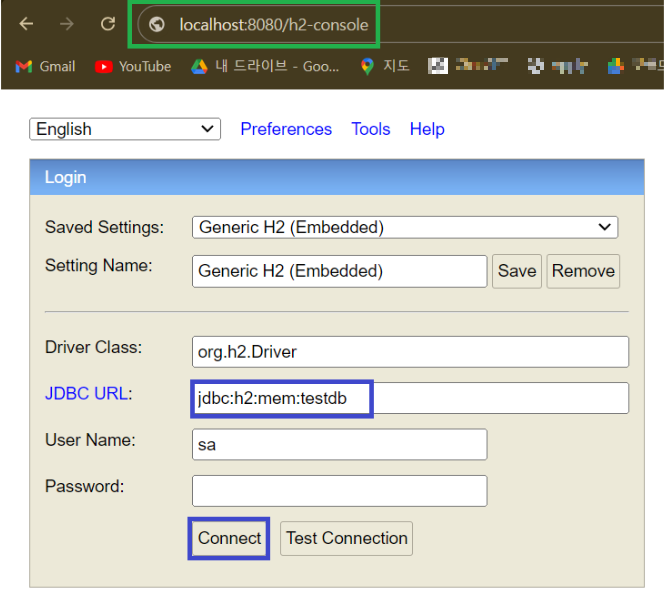 이제 스프링 부트를 실행하고 주소창에 "localhost:8080/h2-console"을 입력하면 웹 콘솔을 통해 DB에 접속됩니다. JDBC URL 입력란에 위에서 설정한 jdbc:h2:mem:testdb" 를 입력하고 Connect를 눌러주면 DB에 접속됩니다.