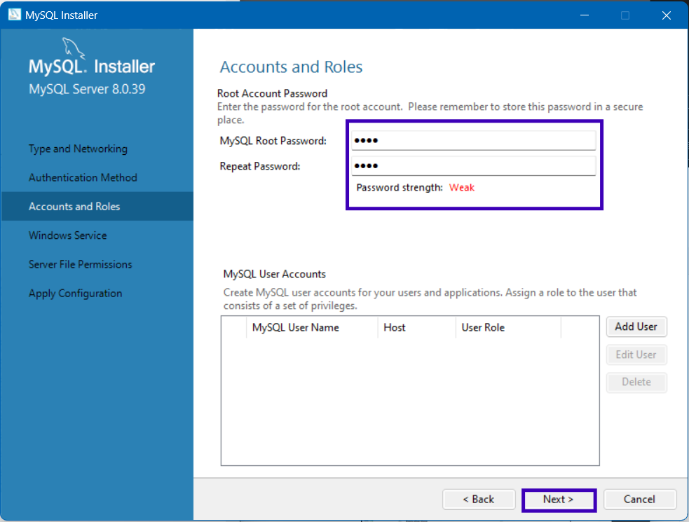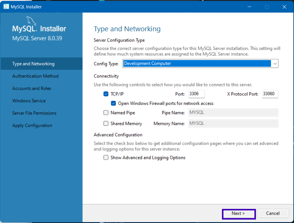 다음과 같이 ‘TypeandNetworking’설정 창이 나타납니다.기본 옵션 그대로 진행하면 됩니다. 만약 컴퓨터에 MariaDB가 이미 설치 되어 있다면 포트 번호 3306를 이미 사용하고 있을 수 있습니다.이런 경우 다른 포트로 변경해줘야 합니다.‘Next’버튼을 클릭해서 다음 단계로 넘어갑니다.