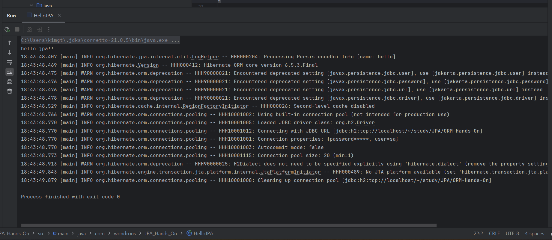 정상적으로 "hello jpa!!"가 출력되었고, persistence.xml에서 설정된 정보, 하이버네이트에서 설정한 DB 연결 정보와 방언 정보, 연결 풀 설정 등이 정상적으로 인식되어 콘솔에 출력됩니다.