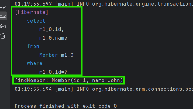 위의 그림에서처럼, 영속성 컨텍스트에 해당 엔티티가 없으므로 SQL을 통해 DB에서 조회한 것을 볼 수 있습니다.