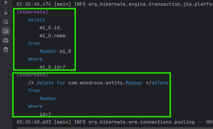 다음으로 DELETE 쿼리가 수행되어 영속성 컨텍스트에서 제거된 내용이 반영되었습니다.
