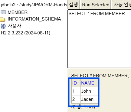 코드를 실행 결과, 위처럼 자동으로 SQL이 실행되고 DB에 영속성을 추가했던 Member 엔티티들이 저장된 것을 확인할 수 있습니다.