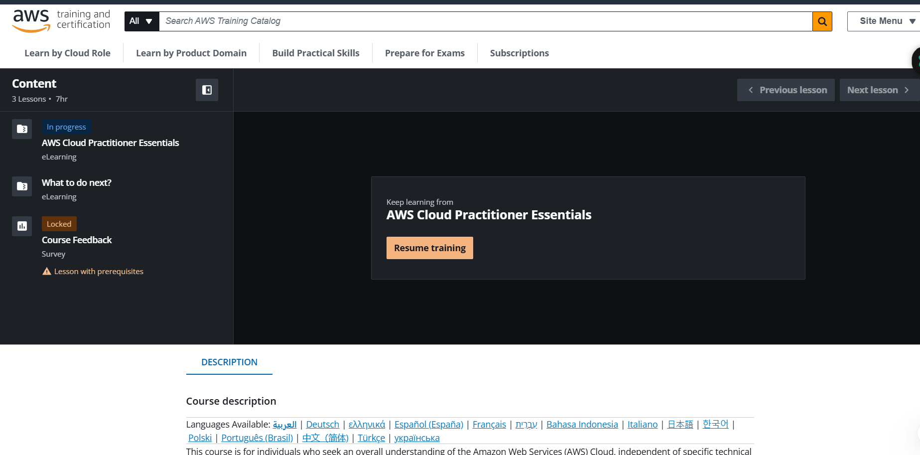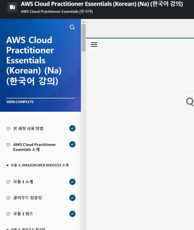 특히, 위에서 노란색으로 표시한 AWS Cloud Practioner Essentials는 무료 백서 강의로 한 번쯤은 듣고 정리하는 것을 추천합니다. Essentials 강의에 들어가면 아래와 같이 기본 개념 강의를 제공하며 한국어 강의도 제공합니다.
