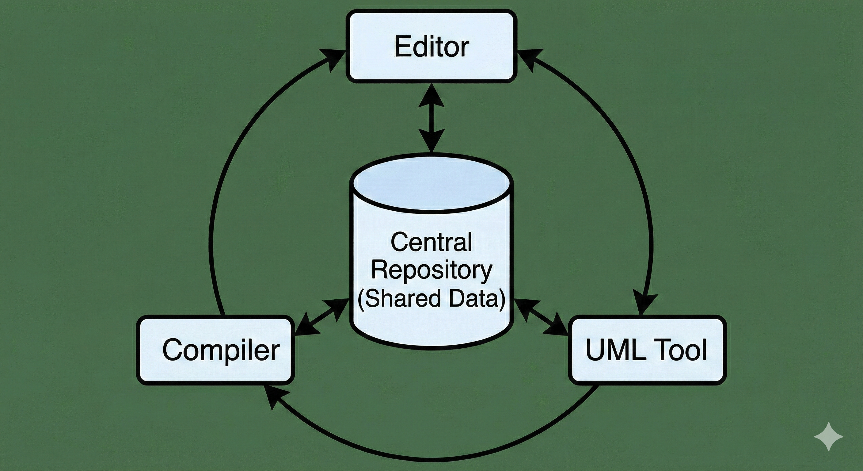 - 예시: IDE(통합 개발 환경)에서 프로젝트 리포지토리를 중심으로 에디터, 컴파일러, UML 툴들이 데이터를 공유하는 구조.