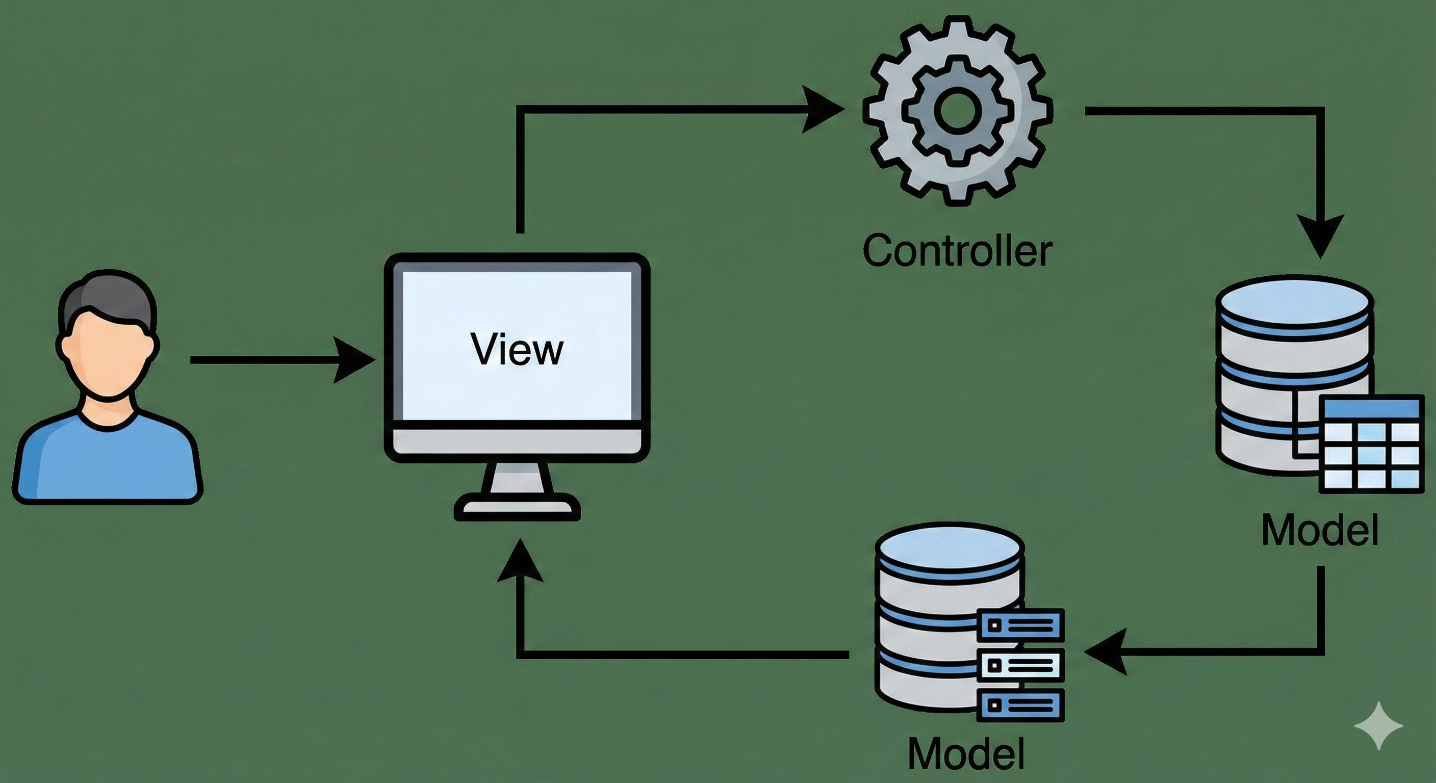 - 웹 애플리케이션 예시: 브라우저(View)가 HTTP 요청을 보내면 컨트롤러가 처리하고, 모델(DB)을 업데이트한 뒤, 동적으로 페이지(View)를 생성해 응답합니다.