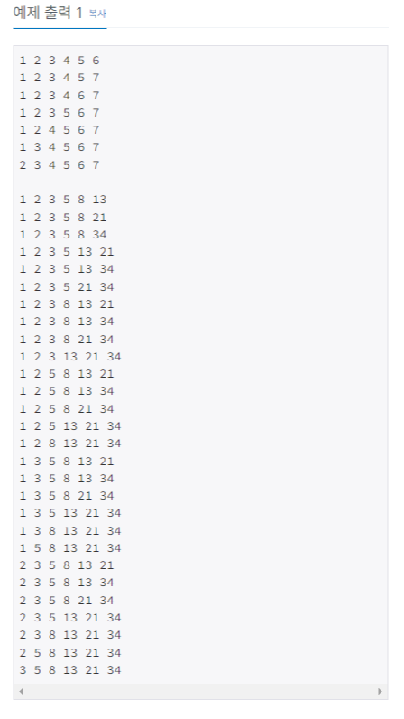 입력은 여러 개의 테스트 케이스로 이루어져 있다. 각 테스트 케이스는 한 줄로 이루어져 있다. 첫 번째 수는 k (6 < k < 13)이고, 다음 k개 수는 집합 S에 포함되는 수이다. S의 원소는 오름차순으로