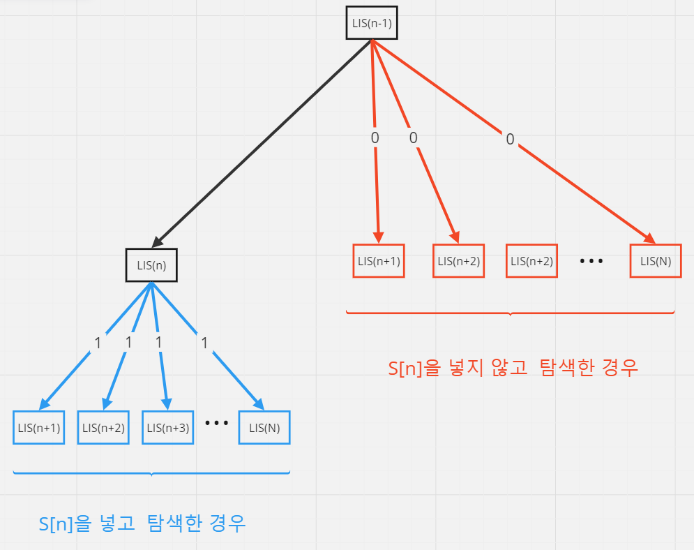 S(1)을 넣고 탐색하는 부분 문제 1과 S(1)을 넣지 않고 탐색하는 부분 문제 1이 반복된다.